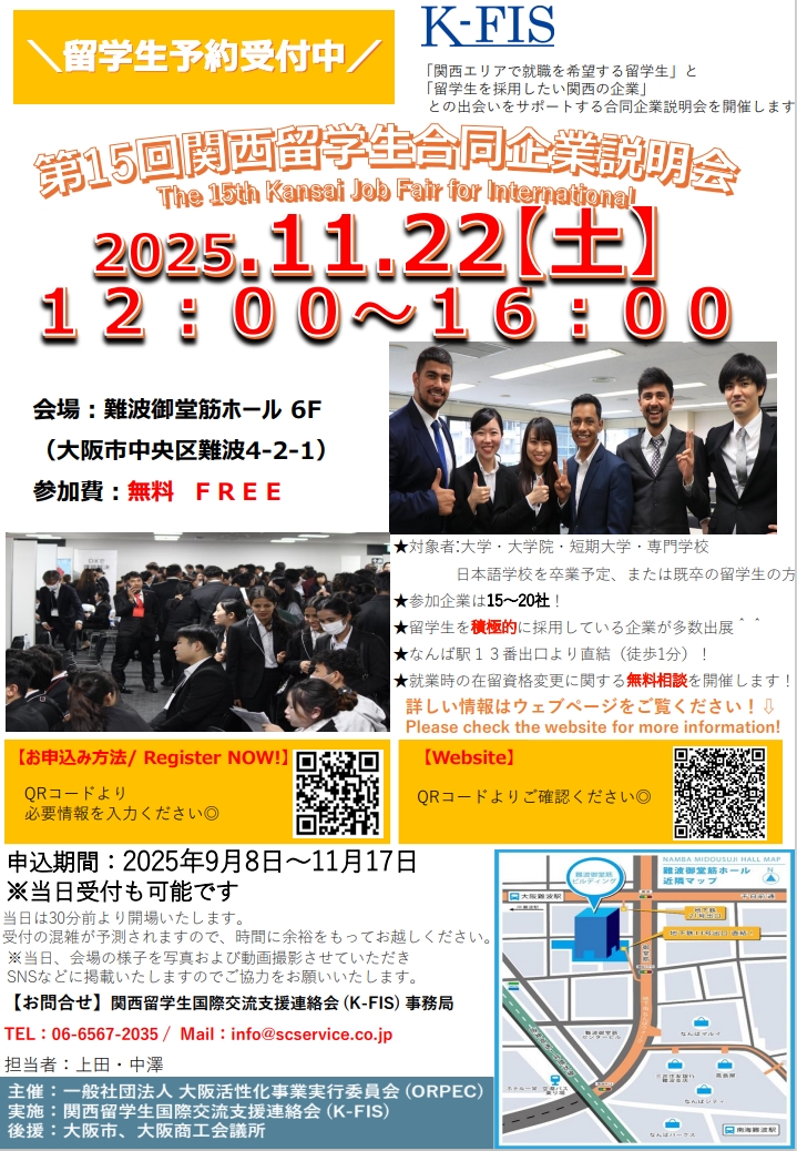 第15回目となる『関西留学生合同企業説明会』を開催します。