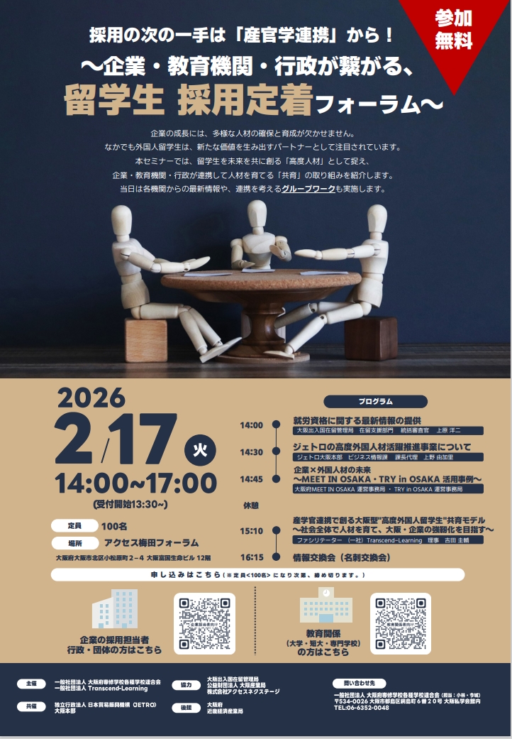 当日は各機関からの最新情報や、連携を考えるグループワークも実施します。【主 催】一般社団法人大阪府専修学校各種学校連合会(大専各)/一般社団法人Transcend-Learning