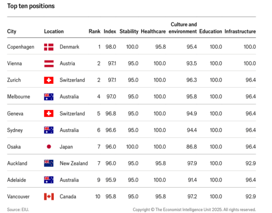 英経済誌エコノミストの調査部門(EIU)が世界の住みやすい都市ランキング2025年版(The Global Liveability Index 2023)では、デンマークの首都コペンハーゲンが世界で最も住みやすい都市の称号を獲得しました。