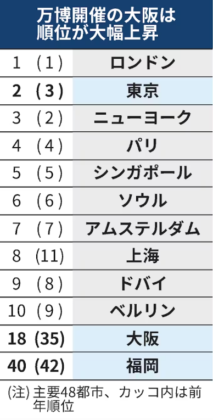森記念財団都市戦略研究所が本日17日に発表しました「世界の都市総合力ランキング2025」で、大阪が18位と前年の35位から大幅に順位を上げました。