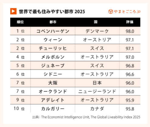 - 採世界の住みやすい都市ランキング 大阪7位!