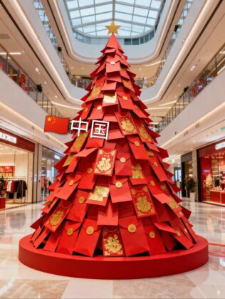 赤に漢字の「福」、中国らしいクリスマスツリーです。