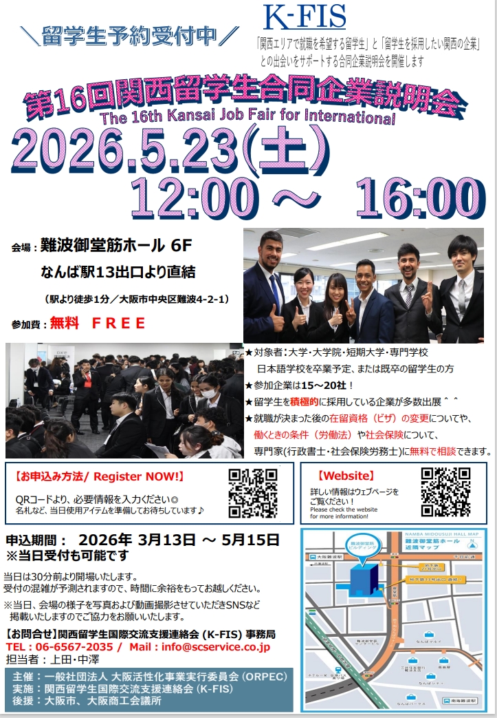 第16回目となる『関西留学生合同企業説明会』を開催します。