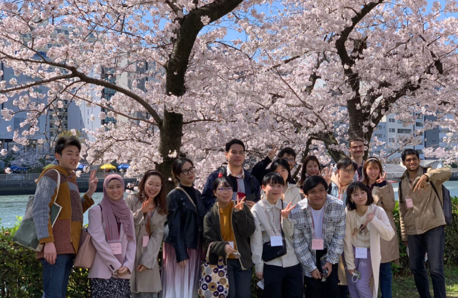 真っ青な空と川に映える桜を眺めながら、留学生と日本人学生の会話に花が咲きました!